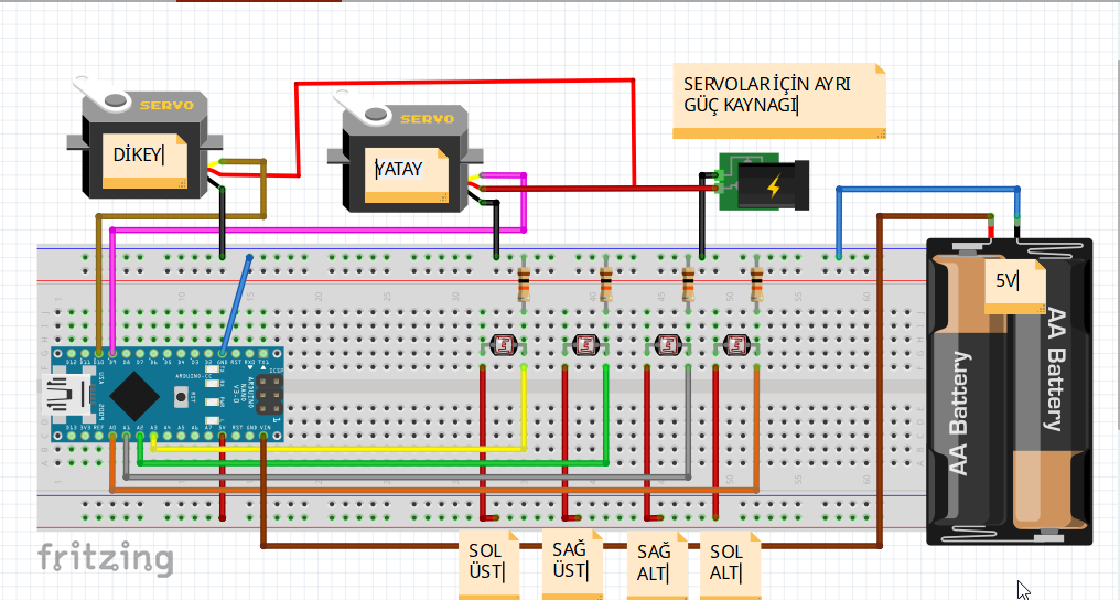 Not: Servo motor için ayrı güç kaynağı koydum bunun sebebi paneliniz ağır olursa servolar zorlayacak haliyle amper çekmek isteyecektir ve arduinonuz riske girecektir. 😉