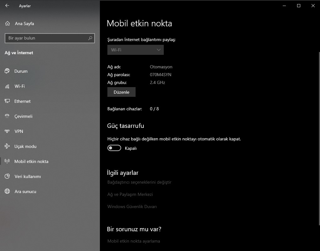 Açılan pencerede Düzenle butonuna tıklayın. Sonrasında gelen ekrandaki ayarları doldurduktan sonra Kaydet butonuna basın. Tekrar Bildirim Merkezi’ne giderek Mobil Etkin Nokta simgesine tıklayın.