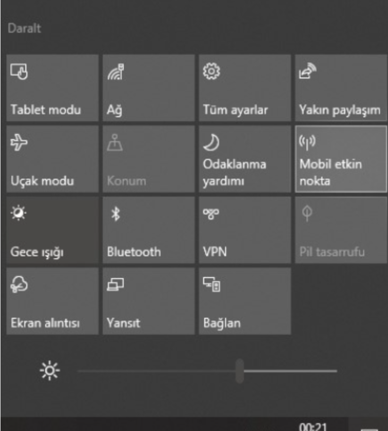 Sağ alt köşede bulunan Bildirim Merkezi simgesine tıklayın. Açılan pencereden Mobil Etkin Nokta sekmesine sağ tıklayarak Ayarlar’a gidin butonuna basın.