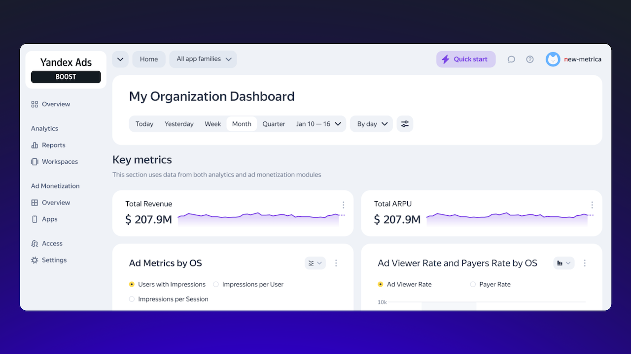 AppMetrica teknolojisinden güç alan Yandex Ads Boost, teknoloji, ürün, büyüme ve pazarlama gibi birçok proje ekibine entegre analiz olanakları sunuyor. Ekipler, uygulamanın teknik durumunu ve potansiyel sorunlarını anlık olarak izleyebilmekte; kullanıcı kitlesiyle ilgili verileri toplayarak daha akıcı ve etkili bir kullanıcı deneyimi oluşturma imkânına sahip olmaktadır. Uygulama içi reklam formatlarının ve yerleşimlerinin gelir ve ürün performansına etkileri detaylı bir şekilde incelenebiliyor. Gelişmiş raporlar ise kullanıcı tutma oranları, dönüşüm hunileri, gelire dair veriler, hedef kitle, dönüşüm oranları ve LTV (yaşam boyu değer) gibi temel performans metriklerini kolaylıkla görüntülemeye olanak tanıyor.
